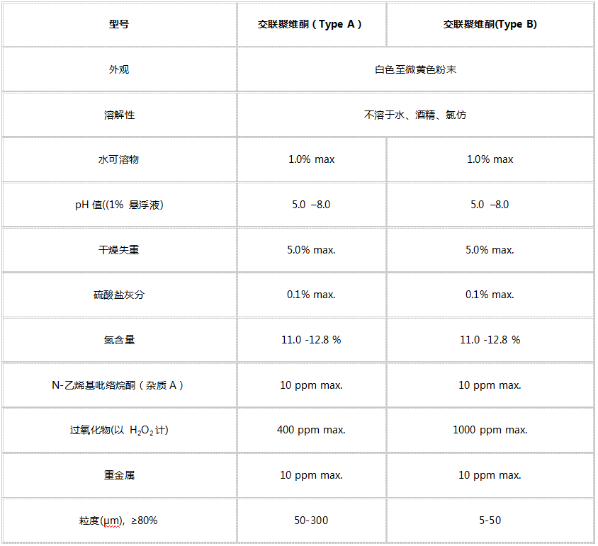 用途:鑒于交聯(lián)聚維酮不溶于水及其他溶劑且遇水迅速膨脹的特性,在制藥工業(yè),其被廣泛用于:1)崩解劑,2)懸浮穩(wěn)定劑,3)水分吸收劑,4)植物提取物或者植物性藥物中丹寧及多酚物質(zhì)的絡(luò)合劑。