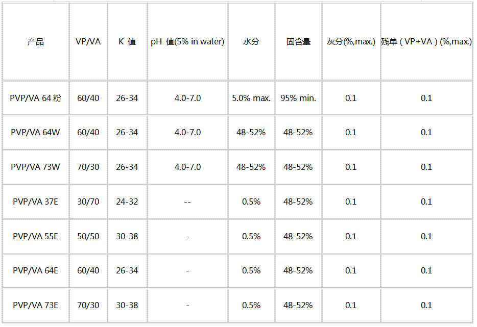 產(chǎn)品特性:VP/VA 產(chǎn)品由不同比例的N-乙烯基吡咯烷酮和醋酸乙烯共聚而成的共聚物,以粉末、液體(包括水溶液和酒精溶液)的形態(tài)存在。溶于水、乙醇等多種有機溶劑。具有良好的成模性,且膜堅硬、光澤好、易水洗。